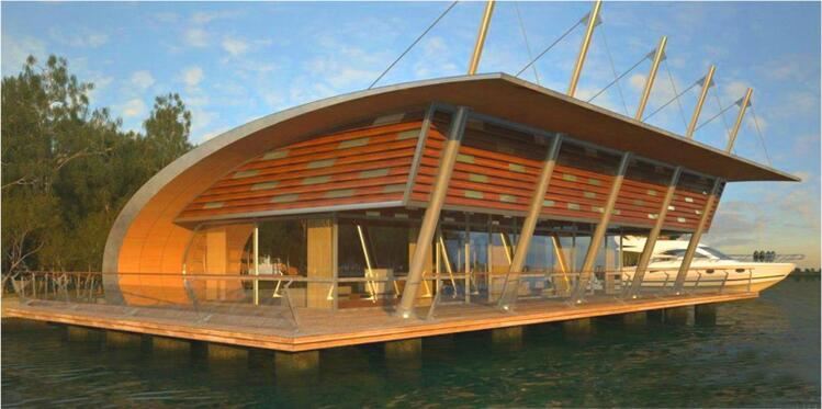 水上建筑設計適宜采用通透的建筑外殼,輕盈的建筑造型,因此該水上運動中心建筑設計采用現代風格,采用鋼架結構的形式,建筑材料專用采用鋼構架、防腐木和玻璃,屋頂設計采用流線型,挑出屋頂的柱子和鋼絲拉線與現狀水上高爾夫的張拉膜結構形成統一風格。