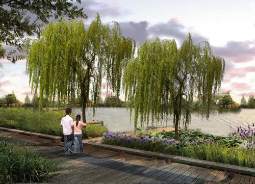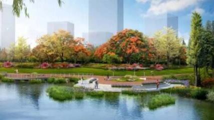 依托現狀地形地貌,打造親水平臺,結合用地規劃打造條狀小游園。