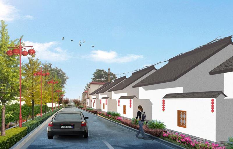 建筑方面,建議將沿街建筑墻面粉刷成白色,勒腳采用青磚貼面,墻面上的窗洞采用木質帶有傳統花紋的格柵。